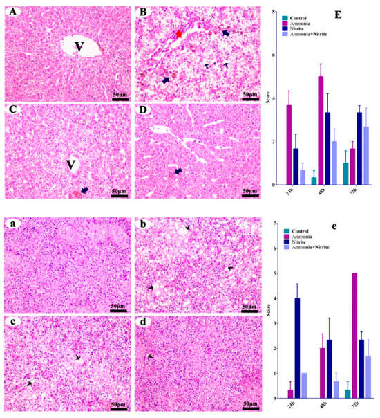 Silver carp hepatic (A–D) and splenic (a–d) histological changes in silver carps after ammonia and nitrite exposure. Quantitative analysis of histopathological changes by cytoplasm vacuolization, and congestion of the veins and sinusoids in the liver (E) and spleen (e) of silver carp during exposure of ammonia, nitrite and the two combined. Error bars show the standard errors (SEs) of the means of three replicates. Thin arrows: cytoplasm vacuolization; bold arrows: melano-macrophage center; red stars: congestion of veins and sinusoids. V: central vein. Scale bar = 50 μm.