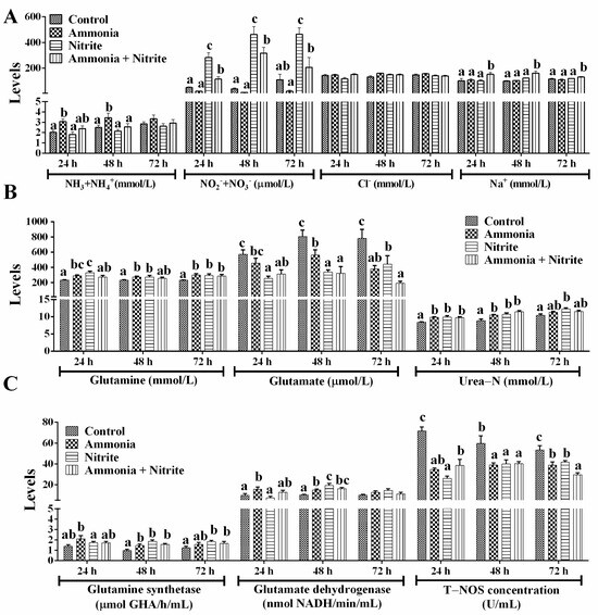 Effects of ammonia, nitrite and a combination of the two on plasmatic ion concentration (A) and nitrogen metabolism (B,C) after 72 h of exposure. Error bars show the SEs of the means of three replicates in the liver and spleen. Different letters above bars represent significant differences (p < 0.05).