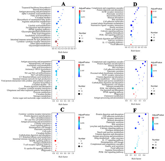 Top 20 KEGG−enriched important pathways. Liver: (A) (ammonia), (B) (nitrite), (C) (ammonia + nitrite). Spleen: (D) (ammonia), (E) (nitrite), (F) (ammonia + nitrite).