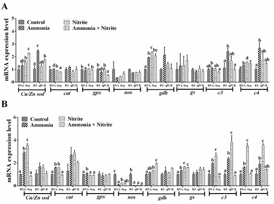 Eight genes involved in the antioxidative response (Cu/Znsod, cat, gpx), nitrogen metabolism (gdh, gs, nos) and the immune response (c3, c4) were used for qRT-PCR verification (Figure 5A,B). We observed the same expression trends of these genes between the qRT-PCR and transcriptome analysis results. Additionally, their expression trend was consistent with their protein level changes in the liver, spleen or plasma (Figure 2 and Figure 3C). Significant increases in hepatic Cu/Zn sod, c3 and c4 were observed in silver carp after ammonia exposure (p < 0.05). However, the levels of hepatic gpx decreased significantly after co-exposure to ammonia and nitrite (p < 0.05). In the spleen, nos expression decreased significantly in the three treatment groups compared with the control group (p < 0.05). Meanwhile, significant increases in c3 and c4 expression levels were observed after ammonia or nitrite exposure (p < 0.05).