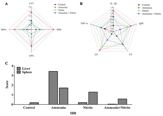 Integrated biomarker response analysis (IBR) analysis in silver carps after exposure to ammonia, nitrite and a combination of the two. Star plots: (A) liver; (B) spleen. IBR values (C).