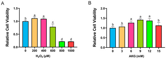 AKG alleviated H2O2-induced decrease in cell viability. (A) Changes in cell viability following 12 h exposure to different concentrations of H2O2. (B) Effects of 24 h AKG pretreatment followed by 12 h 600 μm H2O2 exposure on cell viability. Data are presented as mean ± SD (n = 12). Different letters indicate statistically significant differences (p < 0.05), while shared letters denote no significant differences (p > 0.05).
