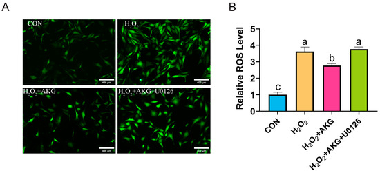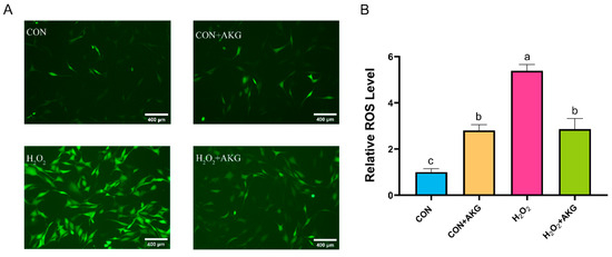 AKG reduced the H2O2-induced increase in ROS. DPCs were pretreated with 6 mM AKG for 24 h and then exposed to 600 μM H2O2 for 12 h. (A) Intracellular ROS content under different treatments. Scale bar = 400 µm. (B) Data visualization and statistical analysis. The fluorescent dye used in this assay was the DCFH-DA probe. Data are presented as the mean ± SD (n = 3). Different letters indicate statistically significant differences (p < 0.05), while shared letters denote no significant differences (p > 0.05).