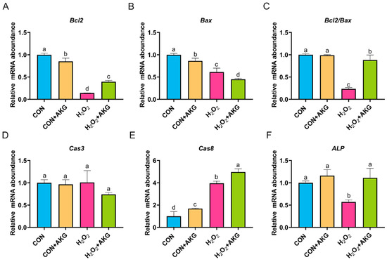 AKG enhances intracellular anti-apoptotic gene expression. DPCs were pretreated with 6 mM AKG for 24 h and then exposed to 600 μM H2O2 for 12 h. (A) Bcl2 mRNA abundance; (B) Bax mRNA abundance; (C) Bcl2/Bax mRNA abundance; (D) Cas3 mRNA abundance; (E) Cas8 mRNA abundance; (F) ALP mRNA abundance. Data are presented as mean ± SD (n = 3). Different letters indicate statistically significant differences (p < 0.05), while shared letters denote no significant differences (p > 0.05).