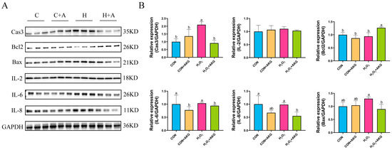 The occurrence of intracellular oxidative stress is typically closely associated with cellular apoptosis and the upregulation of inflammatory factors. To comprehensively investigate the protective effects of AKG against oxidative stress in cells, we systematically examined the expression levels of apoptosis-related proteins, anti-apoptotic proteins, and inflammatory factors. As shown in Figure 5, H2O2 treatment significantly elevated intracellular Cas3 protein expression while showing no significant effects on IL-8, IL-6, Bcl2, or Bax expression. However, compared to the H2O2 group, AKG pretreatment remarkably reduced the intracellular levels of IL-8, IL-6, Bax, and Cas3 proteins while significantly upregulating Bcl2 protein expression. Unexpectedly, IL-2 expression remained unaffected by either H2O2 or AKG treatment.