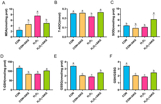 AKG enhances the activity of intracellular antioxidant enzymes. DPCs were pretreated with 6 mM AKG for 24 h and then exposed to 600 μM H2O2 for 12 h. (A) MDA content; (B) T-AOC content; (C) SOD content; (D) T-GSH content; (E) GSSG content; (F) GSH/GSSG ratio. Data are presented as the mean ± SD (n = 3). Different letters indicate statistically significant differences (p < 0.05), while shared letters denote no significant differences (p > 0.05).