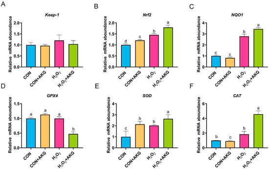 H2O2 upregulates the expression of Nrf2 signaling pathway-related genes. DPCs were pretreated with 6 mM AKG for 24 h and then exposed to 600 μM H2O2 for 12 h. (A) Keap-1 mRNA abundance; (B) Nrf2 mRNA abondance; (C) NQO1 mRNA abundance; (D) GPX4 mRNA abundance; (E) SOD mRNA abundance; (F) CAT mRNA abundance. Data are presented as the mean ± SD (n = 3). Different letters indicate statistically significant differences (p < 0.05), while shared letters denote no significant differences (p > 0.05).