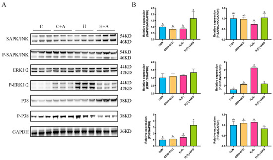 Effects of AKG and H2O2 on MAPK signaling pathway. DPCs were pretreated with 6 mM AKG for 24 h and then exposed to 600 μM H2O2 for 12 h. (A) Protein expression. (B) Data visualization and statistical analysis. Data are presented as mean ± SD (n = 3). Different letters indicate statistically significant differences (p < 0.05), while shared letters denote no significant differences (p > 0.05).