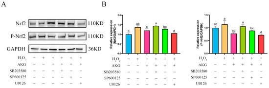 The findings from Section 3.8 and Section 3.9 demonstrated that AKG pretreatment exerted significant regulatory effects on the expression of key proteins in both the Nrf2 and MAPK signaling pathways. Based on these findings, we hypothesized a potential regulatory relationship between the Nrf2 and MAPK pathways. To elucidate the specific regulatory mechanisms linking Nrf2 to the JNK, ERK1/2, and P38 proteins within the MAPK pathway, we conducted intervention experiments using specific inhibitors: JNK inhibitor SP600125, ERK1/2 inhibitor U0126, and P38 inhibitor SB203580. Changes in Nrf2 protein expression across experimental groups were analyzed via Western blot (Figure 10). Compared to the control group, AKG pretreatment significantly upregulated intracellular Nrf2 protein expression. Notably, the addition of the JNK or P38 inhibitor did not affect the AKG-induced upregulation of Nrf2 protein expression. However, when AKG pretreatment was combined with the ERK1/2 inhibitor, Nrf2 protein levels returned to baseline. Similar trends were observed for P-Nrf2: hydrogen peroxide treatment significantly reduced P-Nrf2 expression, and this reduction was further exacerbated by ERK1/2 inhibition.