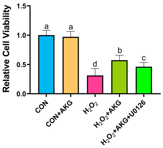 Using the methodology detailed in Section 3.1, we evaluated the impact of AKG pretreatment combined with ERK inhibition on cellular viability. As illustrated in Figure 12, H2O2 treatment significantly decreased cell viability compared to the control group. AKG pretreatment substantially restored viability in oxidative stress-induced cells. However, the co-administration of the ERK1/2 inhibitor U0126 with AKG pretreatment markedly reduced viability compared to AKG pretreatment alone. Notably, AKG pretreatment alone exhibited no statistically significant effect on viability relative to the untreated control.