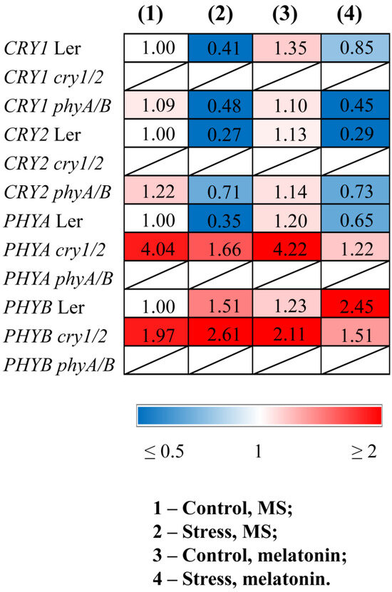 Effects of HL stress and melatonin on the expression of photoreceptor genes. Wild-type and mutant plants were grown on Murashige and Skoog media in Petri dishes for two weeks under a photoperiod of 16 h light/8 h dark at 23 °C and 60 μmol m−2 s−1 (control). Melatonin at a concentration of 50 μm was used for treatment. The experimental plants were exposed to light stress for 24 h at 600 μmol m−2 s−1 (stress). The numbers indicate the baseline ratio of the expression of each gene in the wild type and mutants without treatments and their values under experimental conditions. Statistical analysis for this figure is presented in Table S2.