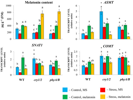 Effects of HL stress and exogenous melatonin on the endogenous melatonin content and the expression of melatonin synthesis genes wild-type and mutant plants were grown on Murashige and Skoog media in Petri dishes for two weeks under a photoperiod of 16 h in the light/8 h in the dark at 23 °C and 60 μmol m−2 s−1 (control). Melatonin at a concentration of 50 μm was used for treatment. The experimental plants were exposed to light stress for 24 h at 600 μmol m−2 s−1 (stress). The data presented in the figure are mean values (n ≥ 3). Error bars represent measurement errors. Different letters indicate statistically significant differences between variants within the same genotype at p < 0.05 (ANOVA with Tukey’s post hoc multiple comparison test). Asterisks indicate statistically significant differences between the mutants and the wild type under the corresponding treatment type at p < 0.05 (Student’s t test).