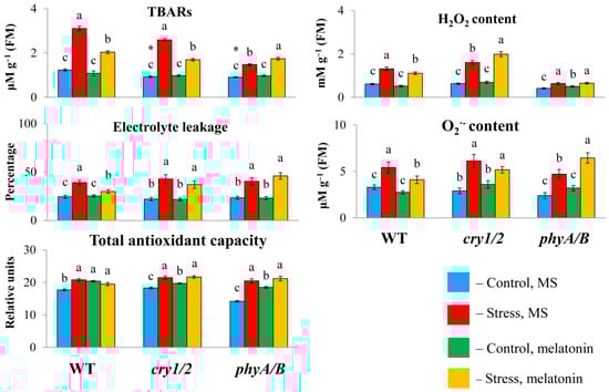Effects of HL stress and melatonin on the TBAR content, H2O2 content, and electrolyte yield. Wild-type and mutant plants were grown on Murashige and Skoog media in Petri dishes for two weeks under a photoperiod of 16 h in the light/8 h in the dark at 23 °C and 60 μmol m−2 s−1 (control). Melatonin at a concentration of 50 μm was used for treatment. The experimental plants were exposed to light stress for 24 h at 600 μmol m−2 s−1 (stress). The data presented in the figure are mean values (n ≥ 3). Error bars represent measurement errors. Different letters indicate statistically significant differences between variants within the same genotype at p < 0.05 (ANOVA with Tukey’s post hoc multiple comparison test). Asterisks indicate statistically significant differences between the mutants and the wild type under the corresponding treatment type at p < 0.05 (Student’s t test).
