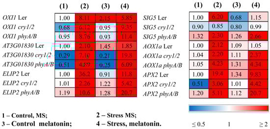 Effects of HL stress and melatonin on the expression of stress marker genes. Wild-type and mutant plants were grown on Murashige and Skoog media in Petri dishes for two weeks under a photoperiod of 16 h in the light/8 h in the dark at 23 °C and 60 μmol m−2 s−1 (control). Melatonin at a concentration of 50 μm was used for treatment. The experimental plants were exposed to light stress for 24 h at 600 μmol m−2 s−1 (stress). The numbers indicate the baseline ratio of the expression of each gene in the wild type and mutants without treatments and their values under experimental conditions. Statistical analysis for this figure is presented in Table S2.