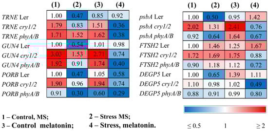 The changes in photosynthetic activity in the mutants treated with MT + HL may be due to the altered content of photosynthetic pigments and the modified expression of genes involved in the chlorophyll biosynthesis pathway. The total carotenoid and chlorophyll (a + b) contents, which decreased under stress conditions, were partly recovered in the LER following the combined application of HL and melatonin (Table 1). However, these indicators remained at stress-reduced levels in melatonin-treated mutants. The reduced expression of trnE, GUN4, and PORB, encoding key steps of chlorophyll biosynthesis under HL stress, was also partially restored by combined MT + HL treatment in WT plants or remained unchanged, but the effect of melatonin treatment was not apparent in stressed mutants. Moreover, melatonin even contributed to the further downregulation of these genes (Figure 5, Table S2).