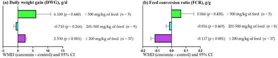 | FCR, g/g | 20 (49) | 1.86 (0.23) | −0.086 (−0.128; −0.043) | <0.001 | 97.77 | <0.001 | 0.468 | 0.399 |