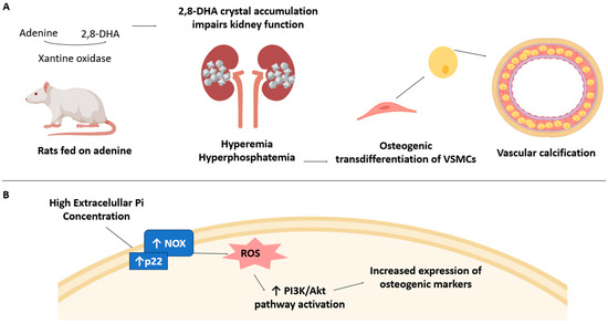 In a rat model fed an adenine-rich diet, elevated serum phosphorus levels were observed, which were positively correlated with the calcium content in the aorta, indicating vascular calcification [40]. As shown in Figure 2, Panel A, the adenine-induced kidney injury model demonstrates that hyperphosphataemia, a consequence of impaired renal function, is strongly associated with VC, as increased serum phosphate levels promote the osteogenic transdifferentiation of vascular smooth muscle cells (VSMCs) into osteoblast-like cells [40]. In this context, studies on uraemic rats have demonstrated that elevated extracellular phosphate levels drive vascular calcification by upregulating NOX4 and its p22 subunit, leading to increased ROS production (Table 2) [17,18]. This phosphate-induced OS facilitates osteogenic transdifferentiation, as evidenced by the upregulation of osteogenic markers, including CBFA1, OSX, E11, DMP-1, and SOST, alongside the downregulation of the VSMC markers α-SMA and SM22α. Figure 2, Panel B, illustrates how the PI3K/AKT signalling pathway plays a central role in this process, as H2O2 stimulates the tyrosine phosphorylation of PI3K, leading to AKT activation—a key step in osteoblast-like transdifferentiation [17,18].