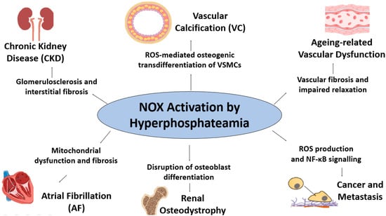 Hyperphosphataemia is increasingly recognised as a key driver of OS across various pathological conditions, with increasing evidence implicating NOX in mediating phosphate-induced redox imbalances. NOX activation under hyperphosphataemic conditions promotes excessive ROS production, exacerbating endothelial dysfunction, VC, chronic inflammation, tumour progression, and renal fibrosis, as summarised in Figure 3. However, further studies are needed to elucidate the signalling pathways underlying NOX activation in response to hyperphosphataemia. By synthesising the current findings, this review lays the groundwork for future research aimed at developing strategies to mitigate phosphate-induced oxidative damage and its pathological consequences.