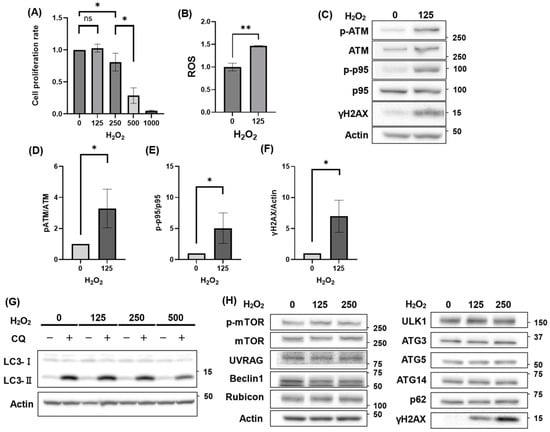 H2O2 treatment reduced cell viability due to DNA damage but did not affect autophagy in HGrC1 cells. (A) Cell viability assessed using the WST-1 assay in HGrC1 cells treated with various concentrations of H2O2 for 24 h. The Y-axis represented absorbance normalized to the control (set as 1), and the X-axis indicated H2O2 concentration (µM). (B) Reactive oxygen species (ROS) levels of HGrC1 cells treated with H2O2 treatment at either 0 or 125 µM for 2 h. The Y-axis shows fluorescence intensity normalized to the average value at 0 µM of H2O2. The X-axis indicates H2O2 concentration (µM). (C) Western blotting (WB) analysis of DNA damage-responsive proteins in HGrC1 cells treated with 0 or 125 µM H2O2 for 24 h. WBs were shown as follows: p-ATM, ATM, p-p95, p95, γH2AX, and Actin. Actin was used as the control. (D–F) Quantification of protein expression levels based on the Western blot results shown in (C). The graphs represented the relative ratios of p-ATM/ATM (D), p-p95/p95 (E), and γH2AX/Actin (F) under the indicated conditions. All values were normalized to the control group (set as 1). (G) Autophagy flux assay in HGrC1 cells. Cells were treated with H2O2 (µM) for 24 h, followed by chloroquine (CQ, 100 µM) for 2 h before the harvest. (H) WB analysis of autophagy-related proteins in HGrC1 cells treated with 0, 125, or 250 µM H2O2 for 24 h. Western blots were shown as follows: p-mTOR, mTOR, UVRAG, Beclin1, Rubicon, ULK1, ATG3, ATG5, ATG14, p62, and Actin. Results were obtained from at least three independent experiments. Significant difference tests were also performed. Data are expressed as the mean ± S.E. * p < 0.05, ** p < 0.01, ns: not statistically significant.