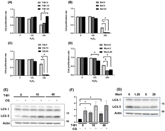 Next, we investigated whether modulation of autophagic activity affects HGrC1 cell viability under oxidative stress caused by H2O2. As shown in Figure 1A, though cell numbers were gradually decreased with the increase of H2O2 concentration, co-treatment with T-B1, an autophagy inducer, significantly increased the cell viability (Figure 2A). When the cells were co-treated with autophagy inhibitors [], Baf and CQ, which suppress lysosomal function and inhibit autolysosome formation, or Wort, which blocks autophagosome formation, Baf and CQ had no significant effect on cell viability at 125 µM H2O2. However, at 250 µM H2O2, almost no viable cells remained in the presence of Baf or CQ (Figure 2B,C).