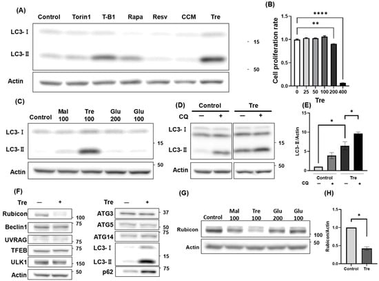 To explore safer alternatives to T-B1 for clinical use, we aimed to identify a natural product capable of activating autophagy, thereby minimizing reproductive toxicity (Figure 3A). In this comparative study, HGrC1 cells were treated for 24 h with each product at multiple concentrations that did not reduce cell viability below control levels, and the highest non-cytotoxic dose that maximized LC3-II expression was selected for further analysis. Consequently, trehalose produced the most pronounced increase in LC3-II levels. Although trehalose is commonly used as a preservative and cryoprotectant for oocyte preservation among carbohydrates [], its cytotoxicity was first evaluated in HGrC1 cells. Trehalose inhibited the growth of HGrC1 cells at 200 mM, and no viable cells were observed at 400 mM trehalose (Figure 3B). Based on these findings, we selected 100 mM trehalose for subsequent experiments, as this concentration was the highest dose that did not compromise cell viability. Trehalose consists of two molecules of α-glucose linked by their hydroxy groups at the first position, whereas maltose consists of two α-glucose molecules linked by their hydroxy groups at the first and fourth positions []. Maltose was used as a counterpart to trehalose, as reported previously []. Among the carbohydrates tested, trehalose, maltose, and an equal amount of glucose, trehalose significantly increased LC3-II expression levels, while glucose and maltose had little effect on autophagy activation (Figure 3C). The flux assay demonstrated that trehalose treatment elevated LC3-II levels compared to the control, and that these levels increased even further with the addition of CQ (Figure 3D). Correspondingly, the quantitative analysis confirmed a significant increase in LC3-II under trehalose treatment, which was further enhanced following CQ exposure, indicating trehalose-mediated activation of autophagy in HGrC1 cells (Figure 3E). Although mTOR inhibition is known to activate TFEB, its expression levels remained unchanged upon trehalose treatment (Figure 3F). Furthermore, trehalose did not affect the p-mTOR/mTOR ratio in HGrC1 cells (Supplementary Figure S3). Subsequently, we comprehensively examined protein expression in trehalose-treated cells. The expression levels of Rubicon, a known inhibitor of the autophagy pathway, decreased dramatically (Figure 3F). Among the carbohydrates tested, Western blot analysis demonstrated that trehalose induced the greatest reduction in Rubicon expression compared to maltose and glucose (Figure 3G). Quantification further confirmed that trehalose treatment led to a significant reduction of over 50% in Rubicon expression, highlighting its potent suppressive effect (Figure 3H). These results revealed that trehalose activated autophagy and reduced Rubicon expression in HGrC1 cells.