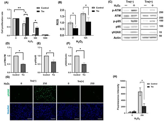 Trehalose-enhanced oxidative stress resistance in HGrC1 cells. (A) Cell viability assessed using the WST-1 assay in HGrC1 cells with various concentrations of H2O2 in the presence of 100 mM trehalose (Tre) for 24 h. The Y-axis represented the mean fluorescence intensity, and the X-axis showed the H2O2 concentration (µM). (B) ROS levels of HGrC1 cells treated with H2O2 treatment at either 0 or 125 µM for 2 h. The Y-axis shows fluorescence intensity normalized to the average value at 0 µM H2O2. The X-axis indicates H2O2 concentration (µM). (C) WB analysis of DNA damage-responsive proteins in HGrC1 cells treated with 125 µM H2O2 in the presence or absence of 100 mM Tre for 24 h. Western blots were shown as follows: p-ATM, ATM, p-p95, p95, γH2AX, and Actin. Actin was used as the control. (D–F) Quantification of protein expression levels based on the Western blot results shown in (C). The graphs represented the relative ratios of p-ATM/ATM (D), p-p95/p95 (E), and γH2AX/Actin (F) under the indicated conditions. All values were normalized to the control group (set as 1). (G) Immunofluorescence staining of γH2AX in HGrC1 cells treated with 250 µM H2O2 in the presence or absence of 100 mM Tre for 24 h. Scale bar, 200 µm. (H) The graphs showed the fluorescence intensity of γH2AX based on the images in (G). The X-axis showed H2O2 concentration (µM), and the Y-axis represented the fluorescence intensity. Results were obtained from at least three independent experiments. Significant difference tests were also performed. Data are expressed as the mean ± S.E. * p < 0.05, ** p < 0.01.
