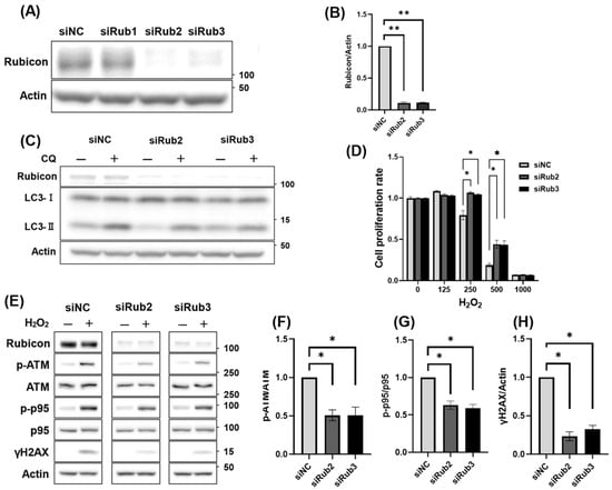 Effects of Rubicon knockdown on autophagy activity and oxidative stress resistance. (A) WB analysis of Rubicon in HGrC1 cells to evaluate the levels of Rubicon knockdown using siRNA. Cells were treated with each siRNA at a final concentration of 10 nM for 48 h. siNC represented the negative control, while siRub1, siRub2, and siRub3 corresponded to siRNAs targeting Rubicon. (B) Quantification of protein expression levels based on the Western blot results shown in (A). The graphs represented the relative expression of Rubicon under the indicated conditions. All values were normalized to the control group (set as 1). (C) Autophagy flux assay in HGrC1 cells, which were introduced with siNC, siRub2, or siRub3. After 48 h of siRNA transduction, cells were treated with 100 µM chloroquine (CQ) for 2 h before the harvest. Actin was used as an internal control. (D) Cell viability assessed using the WST-1 assay in HGrC1 cells, which were introduced with siNC, siRub2, or siRub3, with various concentrations of H2O2. The Y-axis represented the mean fluorescence intensity, and the X-axis showed the H2O2 concentration (µM). (E) WB analysis of DNA damage-responsive proteins in HGrC1 cells, which were introduced with siNC, siRub2, or siRub3, treated with 250 µM H2O2 for 24 h. Western blots were shown as follows: Rubicon, p-ATM, ATM, p-p95, p95, γH2AX, and Actin. Actin was used as the control. (F–H) Quantification of protein expression levels based on the Western blot results shown in (E). The graphs represented the relative ratios of p-ATM/ATM (F), p-p95/p95 (G), and γH2AX/Actin (H) under the indicated conditions. All values were normalized to the control group (set as 1). Results were obtained from at least three independent experiments. Significant difference tests were also performed. Data are expressed as the mean ± S.E. * p < 0.05, ** p < 0.01.