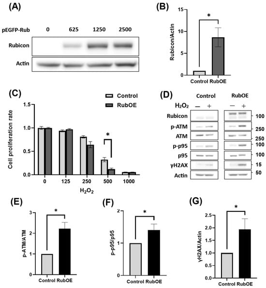 To clarify the relationship between Rubicon expression and H2O2-induced cytotoxicity, we evaluated the impact of Rubicon overexpression on oxidative stress resistance. When H2O2 treatment was performed for 24 h following transfection with the Rubicon-EGFP plasmid, which induced Rubicon overexpression (Figure 6A,B), cell viability was significantly reduced compared to the control (Figure 6C). Notably, under 250 µM H2O2, Rubicon overexpression exhibited a trend toward decreased cell proliferation relative to the control, and this inhibitory effect was significantly enhanced when cells were exposed to 500 µM H2O2. In contrast to the Rubicon-siRNA experiments, Western blot analysis revealed that Rubicon overexpression increased the expression of DNA damage markers, including p-ATM, p-p95, and γH2AX (Figure 6D). Furthermore, quantification of the p-ATM/ATM, p-p95/p95, and γH2AX/Actin ratios demonstrated a significant upregulation of these markers (Figure 6E–G). These results indicated that, unlike Rubicon knockdown, Rubicon overexpression enhanced the inhibitory effect of H2O2 on cell proliferation by potentiating the DNA damage response.