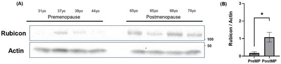 Rubicon expression increases in some organs with aging. The genetic loss of Rubicon prevents the accumulation of misfolded proteins, which are degraded through the autophagy pathway in neurons, leading to the amelioration of aging phenotypes []. Since it is unknown whether Rubicon expression increases in the ovaries with aging, we compared the expression levels of Rubicon in human ovaries between postmenopausal and menstruating women. As expected, Rubicon levels in whole ovarian tissues were significantly higher in postmenopausal women than in menstruating women (Figure 7A,B). Thus, aging affects Rubicon expression in human ovaries.