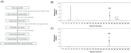 Scheme (A) showing process of extracting water-soluble fraction of Rhus semialata Gall extract. Representative high-performance liquid chromatography chromatogram at 280 nm: standard solutions of (B) WRGE, (C) PGG.