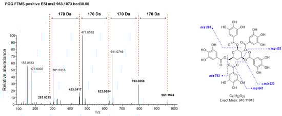 WRGE was extracted from Rhus semialata gall as previously described (Figure 1A), and the extraction yield was 52%. The presence of PGG in WRGE was confirmed by comparison with an authentic PGG standard. HPLC-DAD analysis at 280 nm revealed a PGG peak in the WRGE sample with an RT of 18.16 min (Figure 1B), identical to that of the PGG standard (Figure 1C). Based on the absorption profile and the retention, PGG was identified as a major compound in the WRGE. The results confirmed that WRGE contained 9.7 ± 0.7% of PGG. In the HRESIMS/MS data of WRGE, PGG was detected with an m/z value of 963.1067 [M+Na]+, and its fragment ions of PGG were observed at m/z 793.0845 [963.1067—C7H5O5]+, 623.0590 [793.0845—C7H5O5]+, 453.0417 [623.0590—C7H5O5]+, and 283.0262 [453.0417—C7H5O5]+, corresponding to the sequential loss of galloyl (C7H6O5) units (Figure 2). These results confirm that the structure of PGG in WRGE is composed of five galloyl units, consistent with its known structural characteristics.