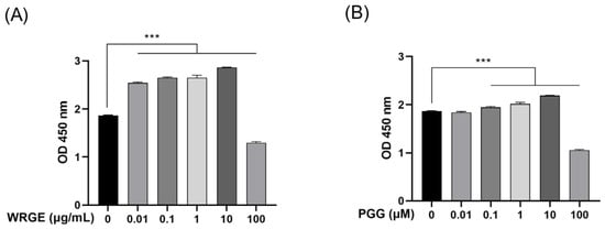 Effects of WRGE and PGG on cell viability in HDPCs. (A) HDPCs treated with indicated concentrations of WRGE for 24 h. (B) HDPCs treated with indicated concentrations of PGG for 24 h. Cell viability of HDPCs was measured via WST-8 assay. Results are presented as mean ± SD of three independent experiments and were analyzed with one-way ANOVA followed by Tukey’s test. *** p < 0.001.