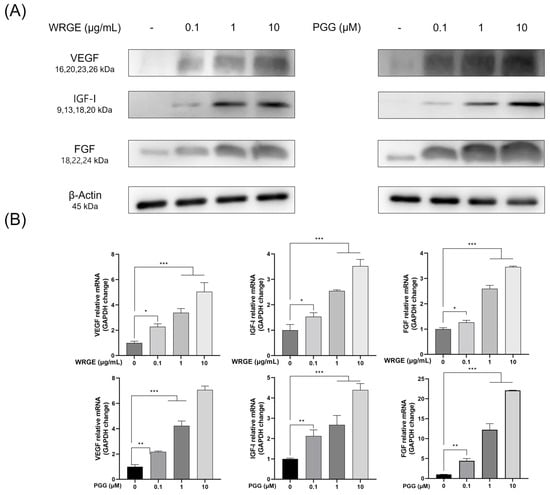 Hair growth factors, including VEGF, IGF-1, and FGF, play crucial roles in the growth and differentiation of HDPCs and regulate new hair formation [,]. HDPCs produce growth factors, including VEGF, IGF-1, and FGF. IGF-1 and FGF promote hair growth by inducing follicular tissue growth and the proliferation of hair follicle cells, and VEGF also enhances hair growth by stimulating angiogenesis, thereby supplying nutrients to hair follicle cells []. Therefore, we investigated whether WRGE and PGG affected the expression of hair-inductive factors. Treatment with WRGE and PGG significantly increased the protein expression levels of VEGF, IGF-1, and FGF in a dose-dependent manner (Figure 4A). Furthermore, WRGE and PGG significantly upregulated the mRNA expression levels of these growth factors in HDPCs (Figure 4B). These results indicate that WRGE and PGG promote the proliferation and expression of hair-inductive properties factors in HDPCs.