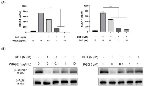 Effects of WRGE and PGG on DHT-induced secretion of DKK-1 and expression of β-catenin in HDPCs. (A) The protein level of DKK-1 analyzed via ELISA. (B) The protein level of β-catenin analyzed via Western blot while β-actin served as a loading control. The ELISA results are presented as the mean ± SD of three independent experiments and were analyzed with one-way ANOVA analysis followed by Tukey’s test. *** p < 0.001 and **** p < 0.0001.