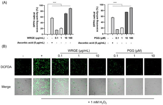 Antioxidant activities of WRGE and PGG. (A) Different concentrations of WRGE and PGG reacted with the DPPH solution for the indicated time. (B) Images of H2O2-induced DCFDA HDPCs captured by confocal microscopy. The DPPH assay results are presented as the mean ± SD of three independent experiments and were analyzed with one-way ANOVA analysis followed by Tukey’s test. *** p < 0.001.