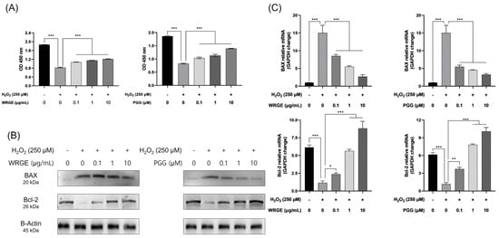 Protective effects of WRGE and PGG on H2O2-induced apoptosis in HDPCs. Reduced cytotoxicity of HDPCs treated with indicated concentrations of WRGE and PGG (A) against H2O2-induced apoptosis. HDPCs were incubated with WRGE and PGG for 24 h followed by treatment with 250 μM H2O2 for 1 h, with cytotoxicity being measured through a WST-8 assay. (B) Protein levels of BAX and Bcl-2 analyzed via Western blotting while β-actin served as a loading control. (C) The mRNA expression level of apoptosis-related genes (BAX and BCL2) was detected via RT-PCR, and GAPDH served as a loading control. The WST-8 assay and qRT-PCR results are presented as the mean ± SD of three independent experiments and were analyzed with one-way ANOVA analysis followed by Tukey’s test. * p < 0.05, ** p < 0.01, and *** p < 0.001.