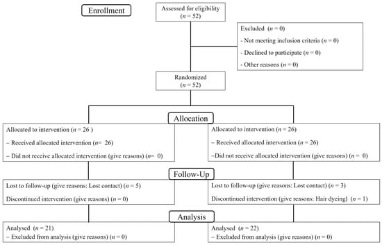 A total of 52 subjects were enrolled and evenly allocated to the intervention and control groups (26 each), with age and sex balanced to maintain group comparability at baseline (Table 2). Of the total 52 subjects, 9 (4 in the test group and 5 in the control group) were lost to follow-up; finally, 43 participated in the study (Figure 10). The homogeneity of the “placebo” group and the “1% WRGE” group was checked. As a result of comparing the measured value of hair density before using the product, no significant difference between the two test groups was found (p = 0.743 > 0.05). Therefore, it was confirmed that these two groups were homogeneous (Table 3).