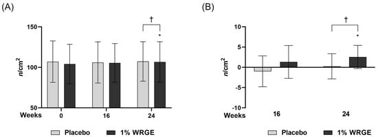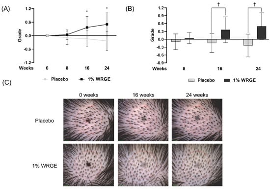 Comparing results of hair density between the “placebo” group and “1% WRGE” group. (A) Absolute hair density value at week 0, 16, and 24 and (B) the change percentage value in hair density. * p < 0.025, † p < 0.025.