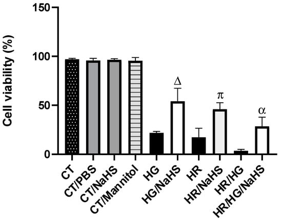 Evaluation of cell viability using the Trypan blue in primary cardiomyocyte cultures. Results from cells incubated with NaHS (100 μM), subjected to high glucose (HG), hypoxia–reoxygenation (HR), or both conditions (HG/HR) are shown. The graph represents the cell viability of the different experimental groups: CT, CT/PBS, CT/NaHS, CT/mannitol, HG, HG/NaHS, HR, HR/NaHS), HG/HR, and HR/HG7NaHS. Δ = p < 0.05 vs. HG; π = p < 0.05 vs. HR; α = p < 0.05 vs. HG/HR. Two-way ANOVA followed by a Tukey post hoc test; n = 6.