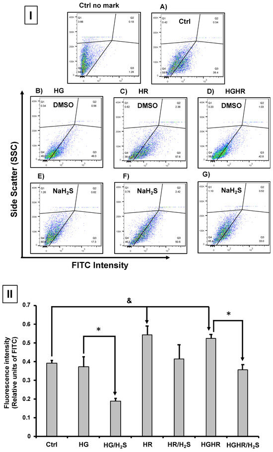 Evaluation of the production of reactive oxygen species (ROS) using the CellROX™ indicator and flow cytometry in primary cultures of cardiomyocytes. (I). (A) Cardiomyocytes with CellROX only (control) and cardiomyocytes with CellROX exposed to (B) HG, (C) HR, and (D) HG/HR. In (E–G) ROS production decreased in cardiomyocytes exposed to HG and HG/HR incubated with NaHS (100 μM). (II) Fluorescence intensity taken from images in (I). & = p < 0.05 vs. Ctrl; * = p < 0.05 vs. HG and HG/HR. Two-way ANOVA followed by a Tukey post hoc test; n = 6.