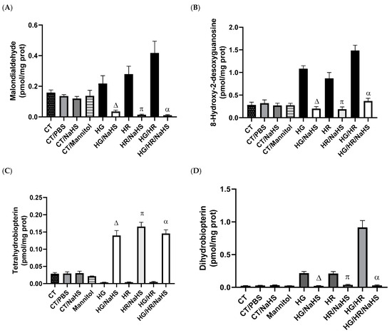 Evaluation of oxidative stress markers of the cofactor for endothelial nitric oxide synthase (eNOS), tetrahydrobiopterin (BH4), and its oxidation product, dihydrobiopterin (BH2) in primary cultures of cardiomyocytes incubated with NaHS (100 μM), and exposed to HG, HR, or both conditions (HG/HR). NaHS reversed the increase in oxidative stress marker concentrations: (A) malondialdehyde, (B) 8-hydroxy-2′-desoxguanosina; it also prevented the oxidation of (C) BH4 and therefore decreased the concentrations of its oxidation product (D) BH2. Δ = p < 0.05 vs. HG; π = p < 0.05 vs. HR; α = p < 0.05 vs. HG/HR. Two-way ANOVA followed by a Tukey post hoc test; n = 6.