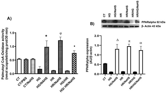 Evaluation of palmitoyl-CoA oxidase activity and PPAR-α expression in primary cultures of cardiomyocytes incubated with NaHS (100 μM), exposed to HG, HR, or both conditions (HG/HR). (A) Incubation with NaHS promoted an increase in PPAR-α expression under HG, HR, and HG/HR conditions. (B) Treatment with NaHS in cardiomyocytes exposed to HG, HR, and HG/HR conditions promoted an increase in PPAR-α expression. ★ = p < 0.05 vs. HG; φ = p < 0.05 vs. HR; ■ = p < 0.05 vs. HG/HR. Δ = p < 0.05 vs. HG; π = p < 0.05 vs. HR; α = p < 0.05 vs. HG/HR. Two-way ANOVA followed by a Tukey post hoc test; n = 6.