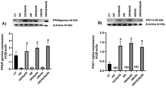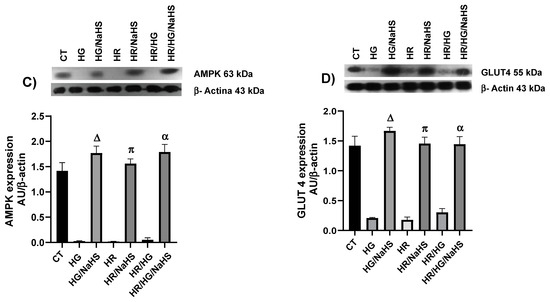 Expression of PPAR-γ, PGC 1α, AMPK, andGLUT4 in primary cultures of cardiomyocytes incubated with NaHS (100 μM), exposed to HG, HR, or both conditions (HG/HR). (A) Incubation with NaHS promoted an increase in PPAR-γ expression under HG, HR, and HG/HR conditions. (B) HG, HR, and HG/HR conditions promoted a decrease in PGC 1α expression. NaHS reversed the decrease in the expression of (C) AMPK and (D) GLUT4 under HG, HR, and HG/HR conditions. Δ = p < 0.05 vs. HG; π = p < 0.05 vs. HR; α = p < 0.05 vs. HG/HR. Two-way ANOVA followed by a Tukey post hoc test; n = 6.