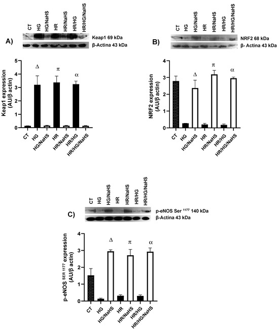 Expression of Keap1, Nrf2 y p-eNOS Ser1177 in primary cultures of cardiomyocytes incubated with NaHS (100 μM), exposed to HG, HR, or both conditions (HG/HR). (A) Incubation with NaHS promoted an increase in Keap 1 expression under HG, HR, and HG/HR conditions. (B) HG, HR, and HG/HR conditions promoted a decrease in Nrf2 expression. NaHS reversed the decrease in Nrf2 expression and (C) p-eNOS Ser1177 under HG, HR, and HG/HR conditions. Δ = p < 0.05 vs. HG; π = p < 0.05 vs. HR; α = p < 0.05 vs. HG/HR. Two-way ANOVA followed by a Tukey post hoc test; n = 3.