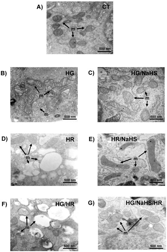 Evaluation of cardiomyocyte ultrastructure in cells incubated with NaHS (100 μM), exposed to HG, HR, or both conditions (HG/HR). NaHS treatment protects cardiomyocytes subjected to HG, HR, or both conditions from mitochondrial ultrastructure damage. (A) CT, (B) HG, (C) HG/NaHS (100 μM), (D) HR, (E) HR/NaHS (100 μM), (F) HG/HR, and (G) HG/HR/NaHS (100 μM). Arrows indicate mitochondria structures.