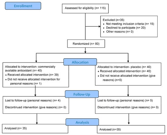 Sample size estimation, using PASS 11 [17], showed that 36 patients were required in each group, assuming a mean difference of 10% [18] between the changes in motility before and after treatment between the groups compared, and using a standard deviation of 15. Assuming that a proportion of patients (10%) would not complete the study, the sample size was increased to 80 men.