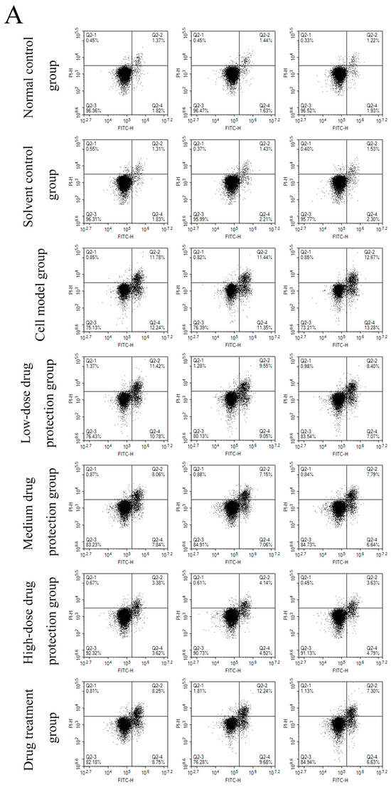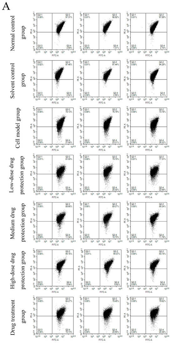 Figure 8A shows the early and late apoptosis of cells in different groups. Figure 8B shows the total apoptotic rate. As shown in Figure 8B, compared with the control group, the model group showed a significantly higher apoptotic rate (24.25%, p < 0.05). Compared with the model group, the drug protection groups showed a significant dose-dependent decrease in the apoptotic rate (p < 0.05). The high-dose drug protection group had a significantly higher apoptotic rate (8.03%) than the control group (p < 0.05). In addition, the drug treatment group showed significantly lower apoptosis rates (17.62%) than the model group and the medium-dose drug protection group (both p < 0.05), but not the high-dose drug protection group (p > 0.05). These findings suggest that Cyanidin-3-O-glucoside can mitigate the Aβ1–42 induced apoptosis in SH-SY5Y cells, with no difference in the protective effect compared with its therapeutic effect.