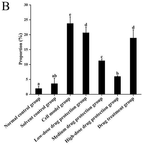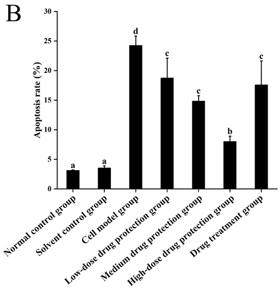 Apoptosis detection ((A): the number of apoptotic cells in each quadrant; (B): total apoptosis rate). Solvent control group: 0.3% Dimethylsulfoxide (DMSO); cell model group: cells were incubated with 1 µM Aβ1–42 for 24 h; low/medium/high-dose drug protection group: cells were pre-treated with 20/40/60 µg/mL Cyanidin-3-O-glucoside for 24 h, followed by incubation with 1 µM Aβ1–42 for 24 h, and Cyanidin-3-O-glucoside was left during Aβ1–42 incubation; drug treatment group: cells were incubated with 40 µg/mL Cyanidin-3-O-glucoside and 1 µM Aβ1–42 for 24 h, and Cyanidin-3-O-glucoside was left during Aβ1–42 incubation. Different lowercase letters indicate significant differences (p < 0.05).