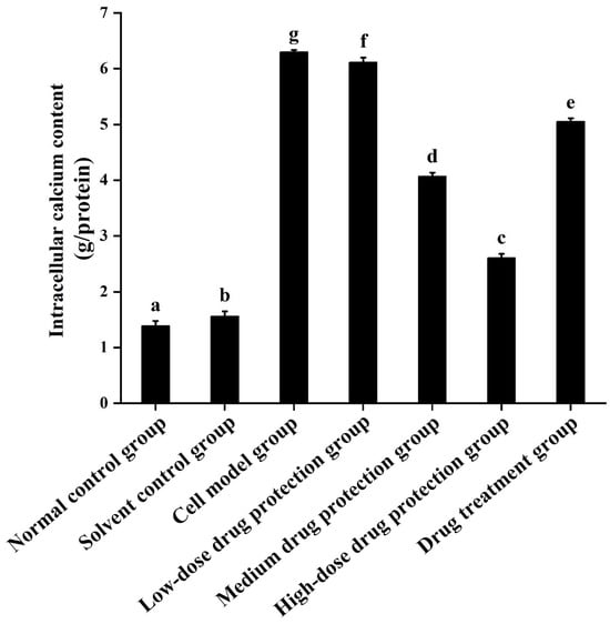 As shown in Figure 6, compared with the control group, the model group showed a significantly higher concentration of calcium ions (6.304 mmol/g prot, p < 0.05). Compared with the model group, the drug protection groups showed a dose-dependent decrease in calcium levels (p < 0.05), with the calcium levels in the high-dose drug protection group being 2.608 mmol/g prot. The treatment group showed significantly lower intracellular calcium levels than the model group and higher intracellular calcium levels (5.056 mmol/g prot, p < 0.05) than the medium-dose drug protection group. This indicates that Cyanidin-3-O-glucoside can mitigate the Aβ1–42-induced increase in calcium ions in SH-SY5Y cells. Further, it showed a significantly better preventive effect than its therapeutic effect.