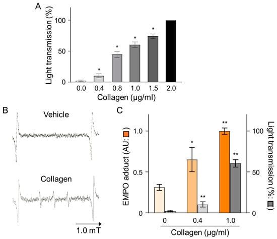 Dose-dependent effects of collagen treatment on EMPO adducts under collagen-induced platelet aggregation in human PRP. (A) Collagen (0–2 μg/mL) was added to PRP, and platelet aggregation was calculated as a percentage relative to vehicle-treated controls (0.9% NaCl, 0 μg/mL). Data are presented as mean ± SD (n = 4–6). (B) Representative ESR spectra of EMPO adducts formed in human PRP treated with collagen (1 μg/mL) or vehicle (0 μg/mL). PRP was pre-incubated with 25 mM EMPO for 2 min before collagen addition, and spectra were recorded 2 min post-treatment. (C) Dose-dependent increases in EMPO adduct formation (